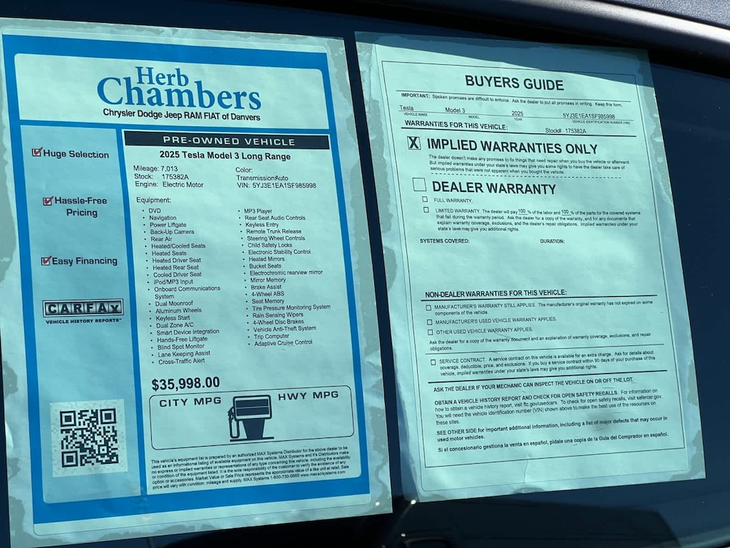 DVD, Navigation, Power Liftgate, Back-Up Camera, Rear Air, Heated Driver Seat, Heated Rear Seat, Cooled Driver Seat, iPod/MP3 Input, Onboard Communications System, Dual Moonroof, Aluminum Wheels, Keyless Start, Dual Zone A/C, Smart Device Integration. MP3 Player, Rear Seat Audio Controls, Keyless Entry, Remote Trunk Release, Steering Wheel Controls. Tesla Long Range with Stealth Grey exterior and Black interior features a Electric Motor with 295 HP at 7000 RPM*. CARFAX 1-Owner 5-Day 100% Money Back Guarantee / 30-Day 1,500 Mile Vehicle Exchange and, A complete Vehicle Portfolio & CarFax. Visit www.herbchamberssmartpricing.com for complete details. Only a Herb Chambers CERTIFIED Pre-Owned vehicle receives a rigorous Multi-Point Inspection Reduced from $35,998. This Model 3 is priced $4,200 below J.D. Power Retail.
